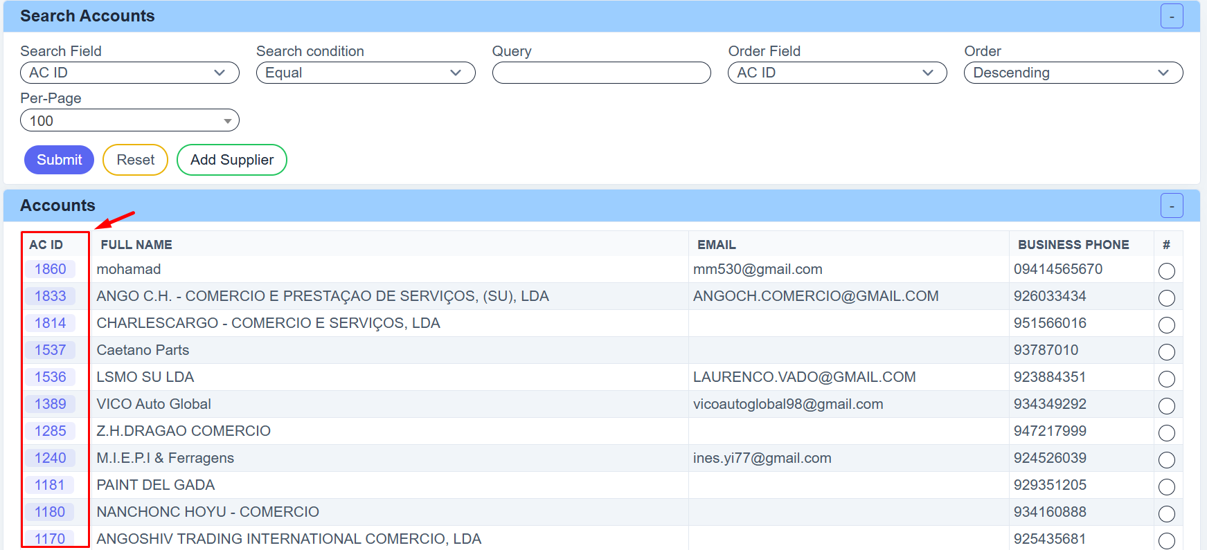- Select the Search Field to choose the information you want to search for, such as Account ID, Name, Email, or Tax Number.