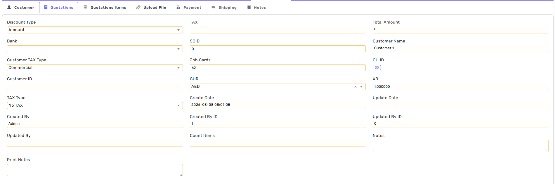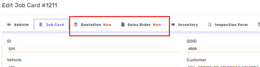 Quotation Tab and Sales Order Tab have been added to the Job Card Dialog